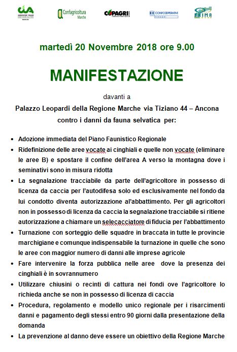CIA, Copagri, Confagricoltura, Fedagri e Confcooperative organizzano una Conferenza Stampa il giorno giovedì 8 Novembre p.v. alle ore 11.00 c/o la sede regionale della CIA Marche c. so Stamira 29 – Ancona per presentare la Manifestazione contro i danni causati da fauna selvatica che si terrà il 20 Novembre p.v. davanti a Palazzo Leopardi della Regione Marche.